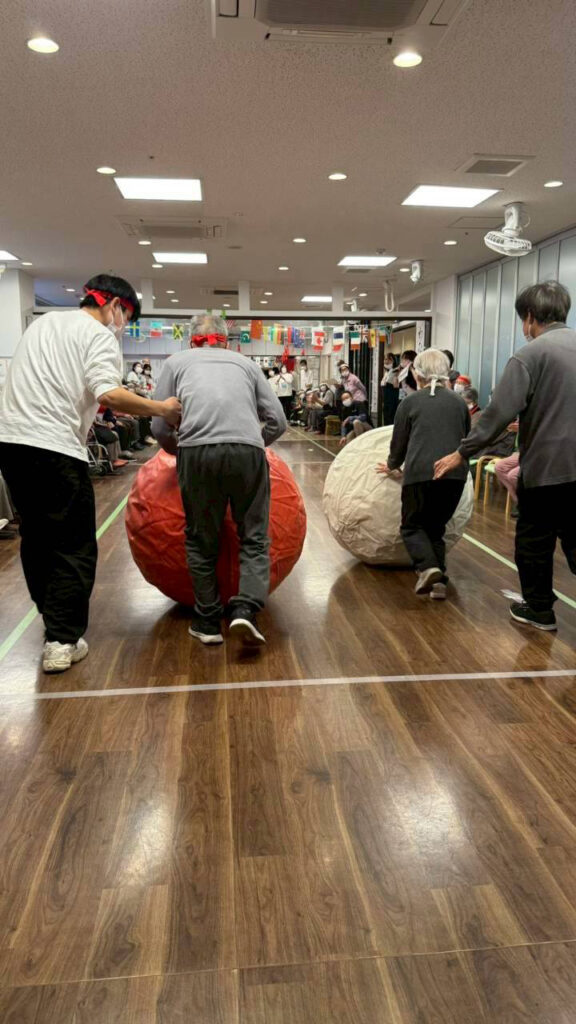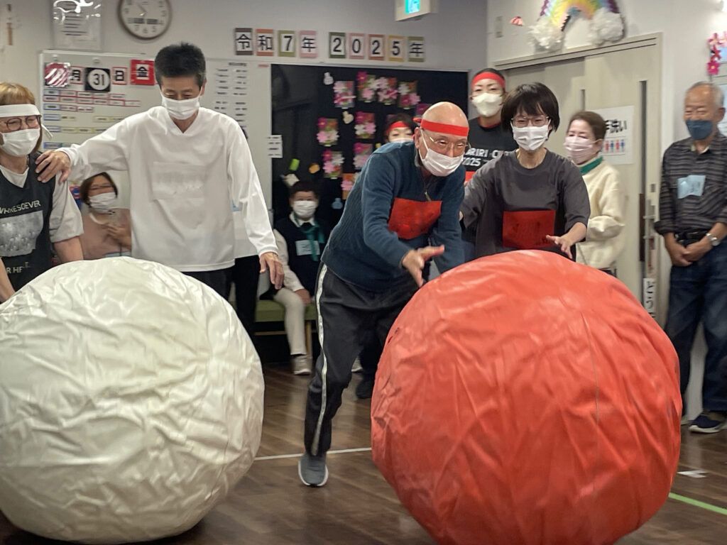 広いフロアを使って、介護スタッフとご利用者さまみんなで運動会を楽しみました。